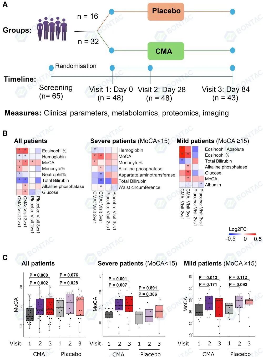 治疗84天后,CMA 组帕金森病患者在MoCA(蒙特利尔认知评估量表)评分上认知功能显著改善(P<0.0001),而安慰剂组无此改善(p>0.05);