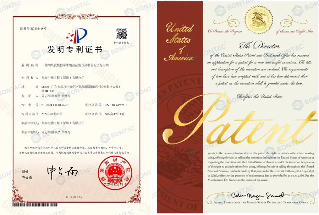 专利保障:邦泰 NR 苹果酸盐已获得中国专利(专利号:202410881394.X)与美国专利(专利号:US12378279B2),技术实力得到国际权威认可,为临床疗效提供了坚实的技术保障。