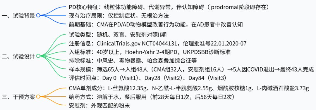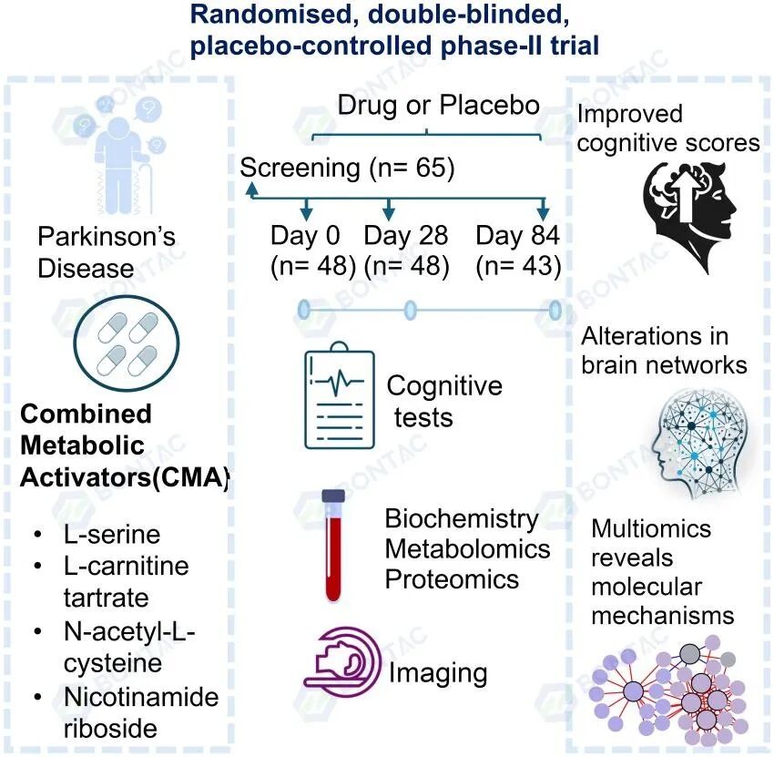 该研究为随机、双盲、安慰剂对照试验,共纳入48名帕金森病患者,治疗周期为84天。疗法采用复合策略,没有使用单一的NR,而是采用了联合多种代谢激活剂。